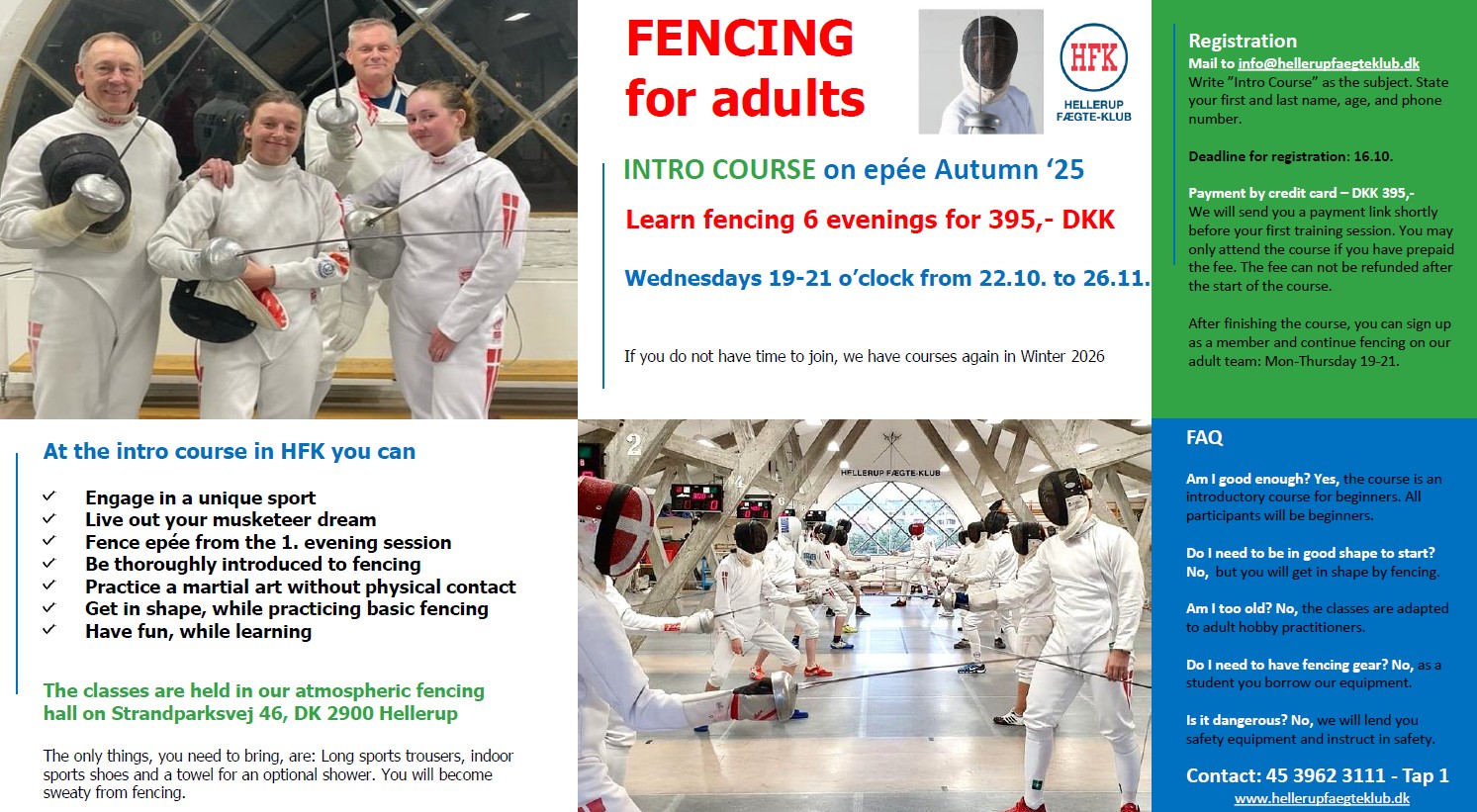 FENCING FOR ADULTS: INTRO COURSE - Learn to fence and get in shape after in the Autumn. We offer a structured course, which over 6 Wednesday evenings introduces you to our great sport. Start Wednesday 22.10., end 26.11. - registration deadline: 16.10. Price: Only 395 Dkr. Adult Introductory Course - Epee - Autum 25 HFK-flyer.pdf