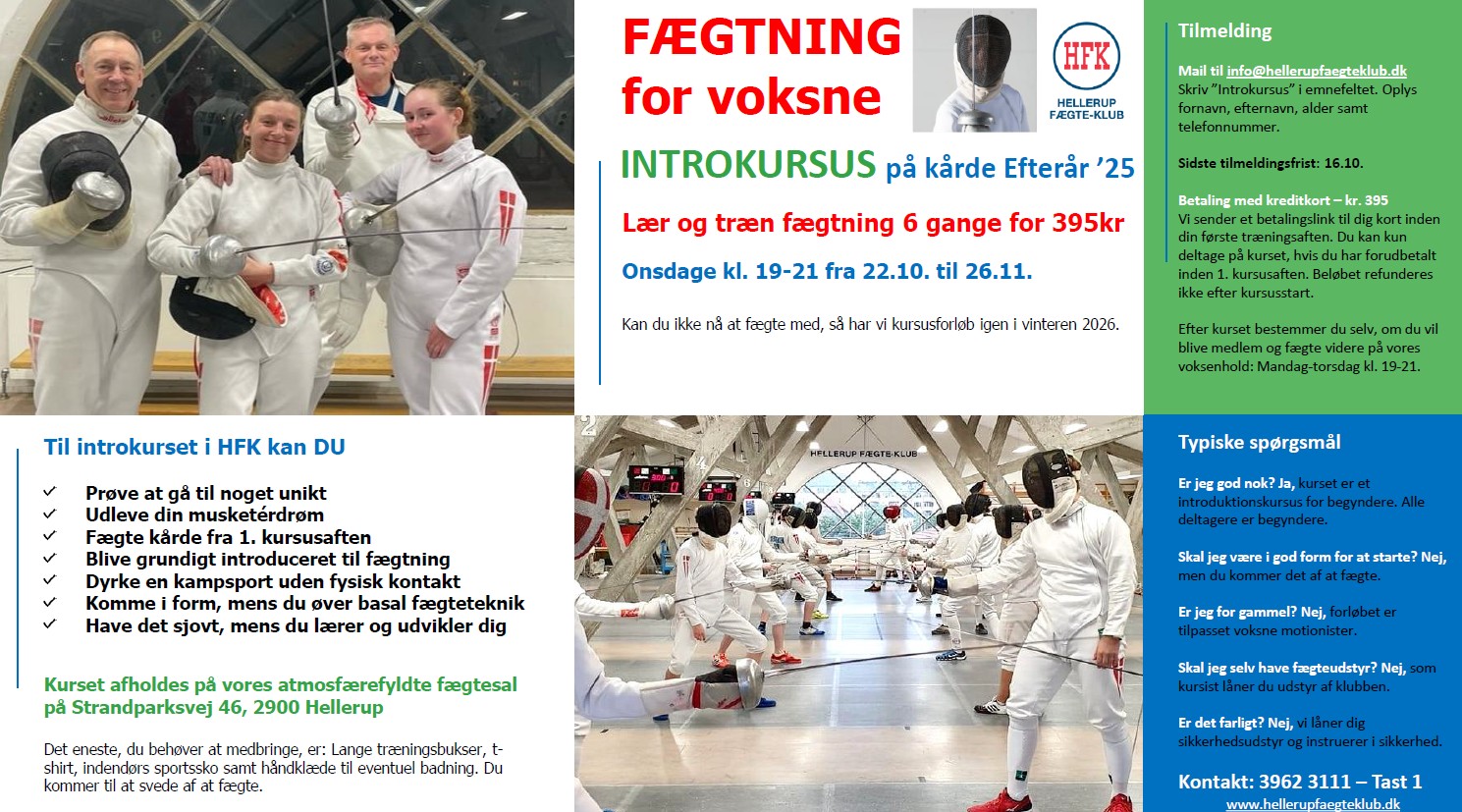 INTROKURSUS FOR VOKSNE I FÆGTNING - Lær at fægte og kom i form i efteråret. Vi har et struktureret kursusforløb til dig, som over 6 onsdagsaftener introducerer dig til vores fantastiske sport. Start onsdag 22.10., slut 26.11.. Tilmeldingsfrist 16.10. Pris: Kun 395kr. Voksen introduktionskursus - kårde - HFK flyer - efterår 25.pdf