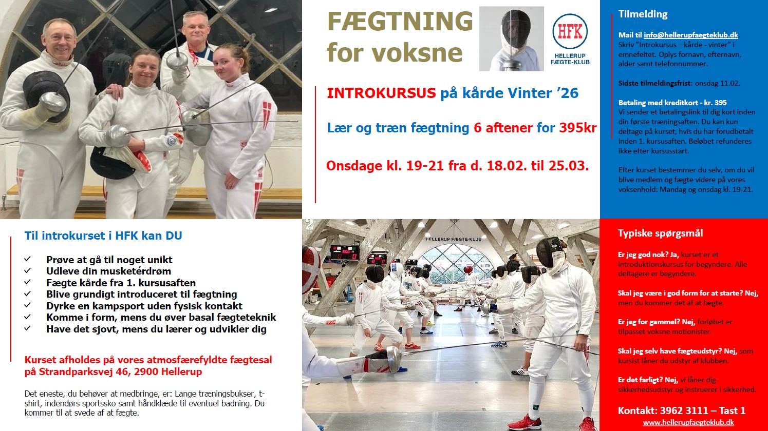 INTROKURSUS FOR VOKSNE I FÆGTNING - Lær at fægte og kom i form over vinteren. Vi har et struktureret kursusforløb til dig, som over 6 onsdagsaftener introducerer dig til vores fantastiske sport. Start onsdag 18.02. Tilmeldingsfrist 11.02. Pris: Kun 395kr. Voksen introkursus - HFK flyer - vinter 2026.pdf